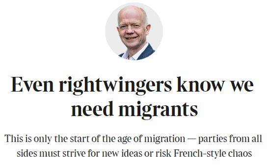 It’s difficult not to give yourself over entirely to despair and despondency in these times. I wasn’t planning to write about immigration. I have another, more culturally orientated article I was working on. The problem though is that the nuances of a movie or book evaporate as soon as you come into contact with an article such as the one written by Tory luminary William Hague, yesterday in the Times. As a content creator, I try to keep abreast and up to date with what my peers are writing about, particularly here on Substack. There’s a degree of incentive to have the novelty take and niche, to wander into the digital wilderness and stick a flag in the virgin territory and claim an issue: transgender, technocracy, the internet itself, Agenda 2030, or political philosophy. The post-liberal scene of disgruntled Gen Xers and Millennials on Substack are aware of the problems associated with mass immigration but the issue has the whiff of the plebiean and low-status about it. Nevertheless, the flow of foreigners into our living space continues unabated, day in and day out.