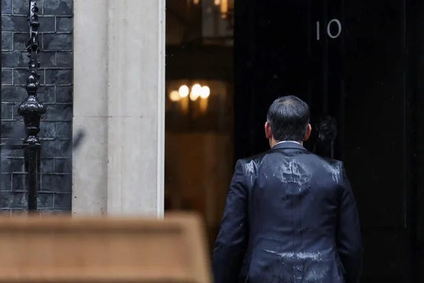 Whatever the case, nobody heard or cared what Sunak actually said, and everyone laughed as he squelched his way back to Number 10. Once in a warehouse job I witnessed a man being fired for thieving. As he left the manager’s office, he walked across the work floor with his head pointed down in shame, not looking anyone in the face. Unfortunately, his electronic card pass had already been revoked, and when he reached the main door, he could no longer get out. He was forced to stand facing the door in embarrassment for five excruciating minutes before the secretary finally took pity on him and ushered him out. Having been soaked down to his expensive undies and drowned both literally and audibly, I began to think that perhaps the minions inside Number 10 would place the cherry on the cake of public humiliation by not letting Sunak through the door and leaving him outside in the rain to Things Can Only Get Better for just a little longer than was absolutely necessary, but I was left disappointed.