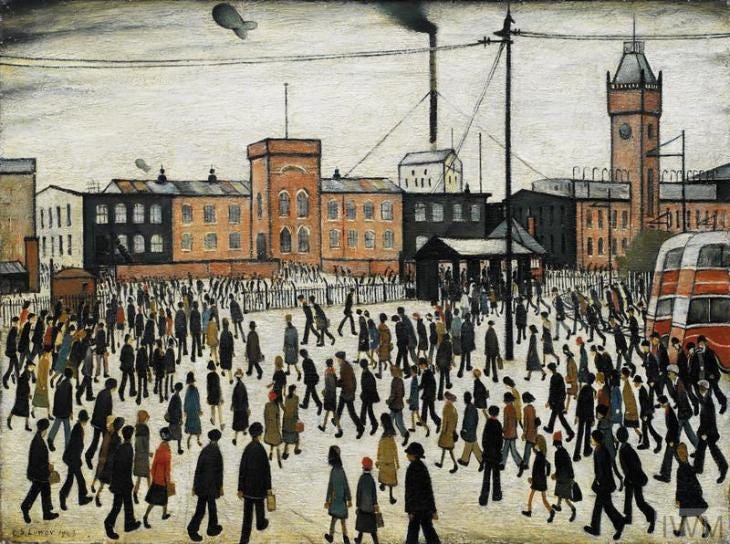 Lovely piece of writing Morgoth. The images painted by Lowry could just as easily have been the scenes at Harland and Wolff shipyard in Belfast, when the workers poured out at the end of the day. Generations of men in my family worked there. At the shipyard’s peak 30,000 were employed there - my great-grandfather worked on Titanic as a very young welder. I grew up in a terraced house that still had the old outside toilet - this was the 80s. The industrial scarring on Belfast was atrophied by the Troubles - the modernisation that came for cities in England just didn’t happen in Belfast until much later.