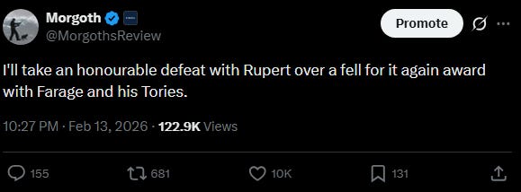 Carl Benjamin, on the Lotus Eaters, recently compared the right-wing ecosystem in Britain to the Middle Ages, with various dukes and barons now expected to declare for either Restore Britain or Reform UK. There are, no doubt, a few sorry sods out there raising their banners for Kemi Badenoch, but in the social media ecosystem, it’s essentially binary.