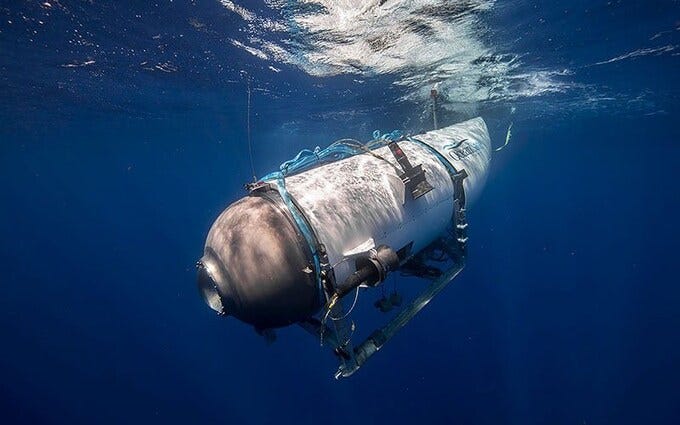 Before the news broke that Rush and all onboard had died instantly in an implosion, it was speculated that they were resting and slowly asphyxiating down by the Titanic, four kilometers down on the sea-bed. The mainstream media then began showing an oxygen countdown clock in a macabre recreation of a Hollywood 90s action movie. Suddenly, our screens were crammed full of boring white men in their 50s who were asked to explain how they would lift a small submarine off the bottom of the ocean. The sugar coating gradually dissolved when it had to be explained that no ships had suitable cables 20km in length, and even if there were, there were no cranes that could lift a vessel off the sea-bed at that depth and 5500 lbs per square inch.