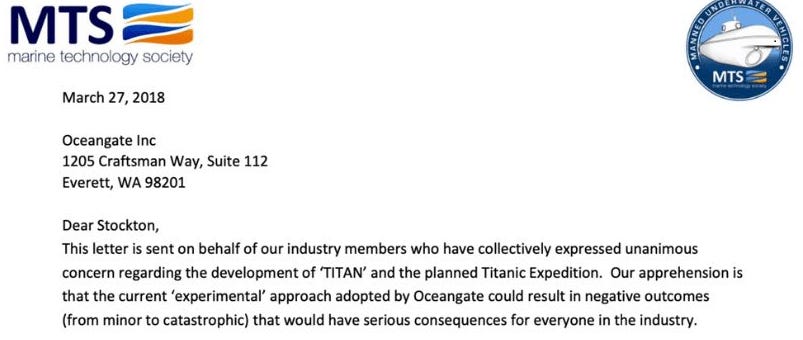 One gets the impression that the guy writing the letter for the Marine Technology Society would be reminiscent of a 90s-era Gene Hackman. Stern and capable, experienced, and used to taking decisions that either grant or take lives. A pragmatic ex-military man in his 50s, and most certainly white. Stockton Rush, then, was being given a wake-up call by his peers who were saying in their own way ‘‘This insanity will end in disaster and ruin the reputation of marine exploration. Please stop this!’’.