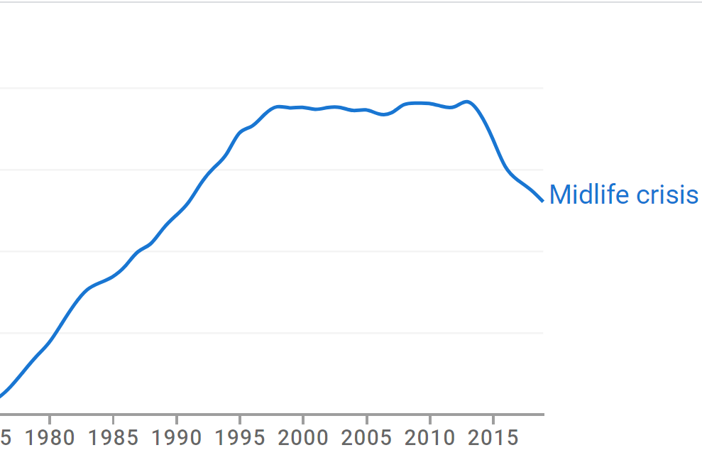Since its heyday in the late 90s and early 2000s, the midlife crisis has faded into relative cultural obscurity. Google’s ever-helpful word usage counter is instructive here.